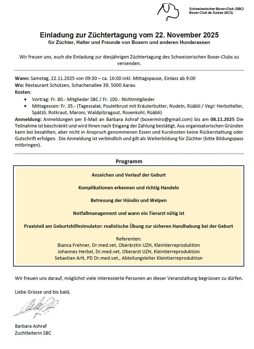 Einladung vom SBC zur Züchtertagung, 22.11.2025